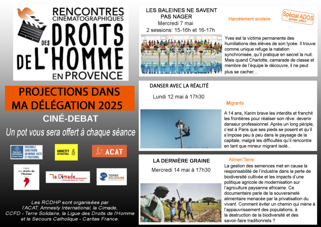 Les Rencontres Cinématographiques des Droits de l’Homme en Provence, ce sont chaque année une dizaine de projections grand public dans des cinémas ou des salles universitaires (Aix-en-Provence, Gardanne, Châteaurenard, Istres et Marseille), permettant de porter un message fort au public et de lui ouvrir un espace de débat avec des spécialistes des Droits Humains.